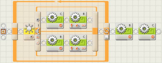 What disadvantage can we observe in the previous program? What we can see is that the program duplicates the line follower code after each intersection. Further on we will see how we can encapsulate this code in a user block or subprogram to make it much more compact and efficient.
