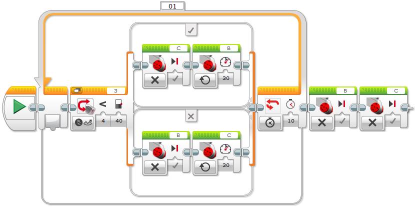 An important aspect before starting the exercise is to ask the students where to add the internal rotation sensor blocks of each motor. Given that the program passes through the same switch branch several times before changing branch inside the loop, as it has been proved, it is important to realize that we need to record the rotations of a motor just before changing the active motor in the switch.