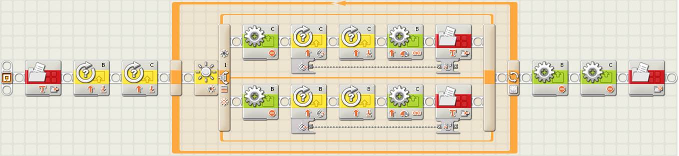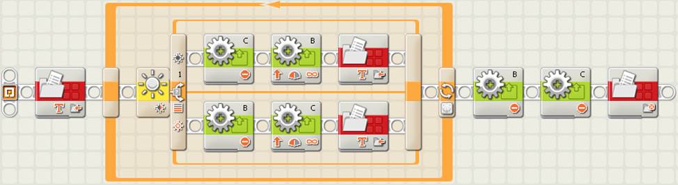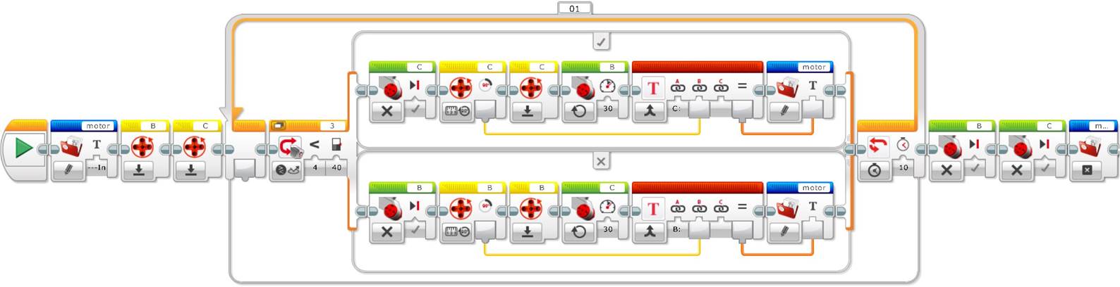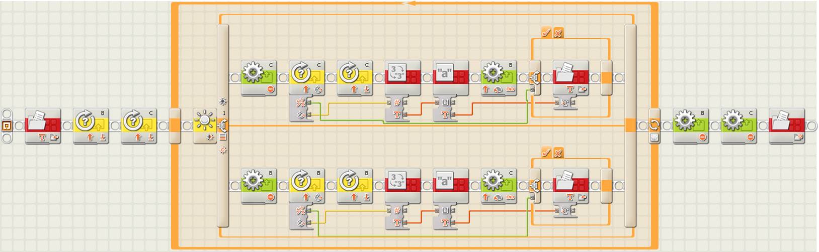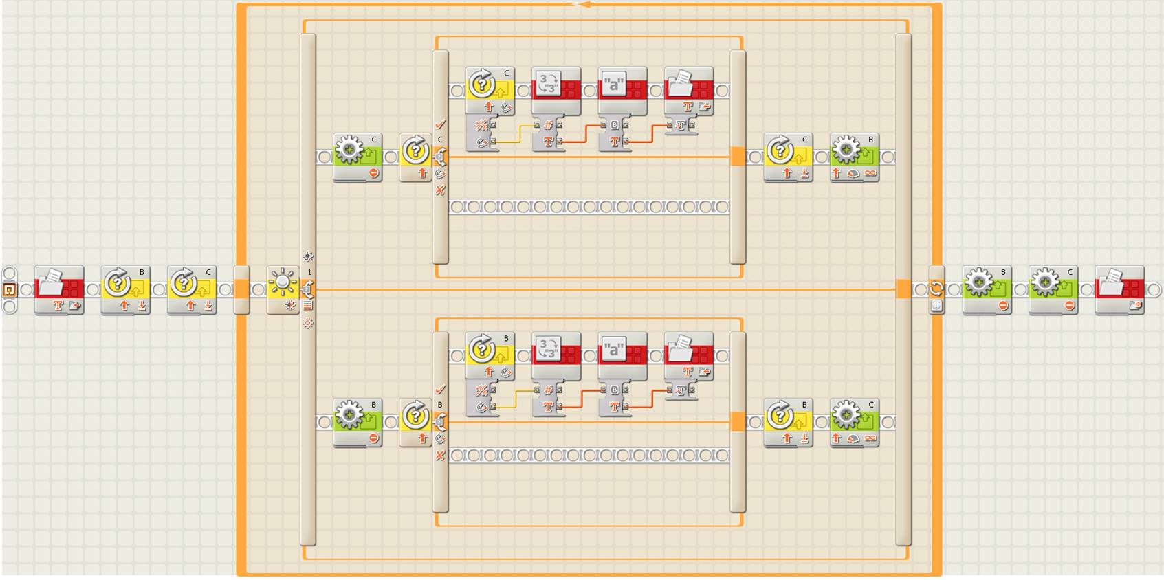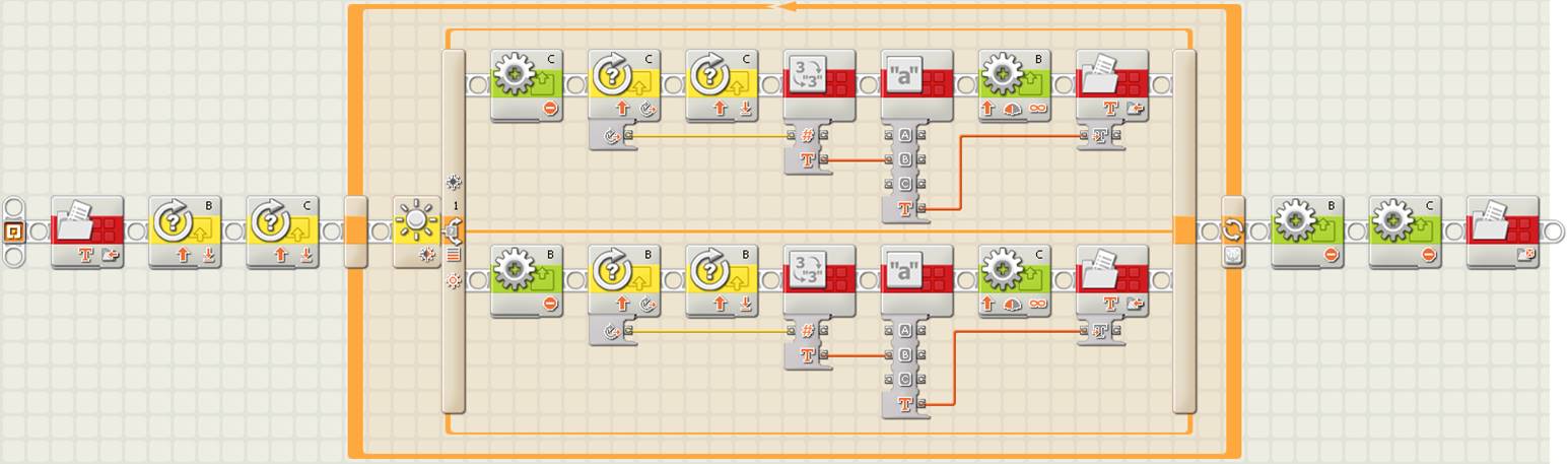 The simplest idea to demonstrate that the intelligent brick executes the program much faster than the robot’s apparent physical execution of the same program is to record the switch branch that is being executed in each iteration of the loop.