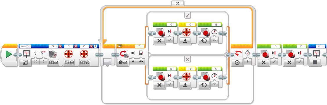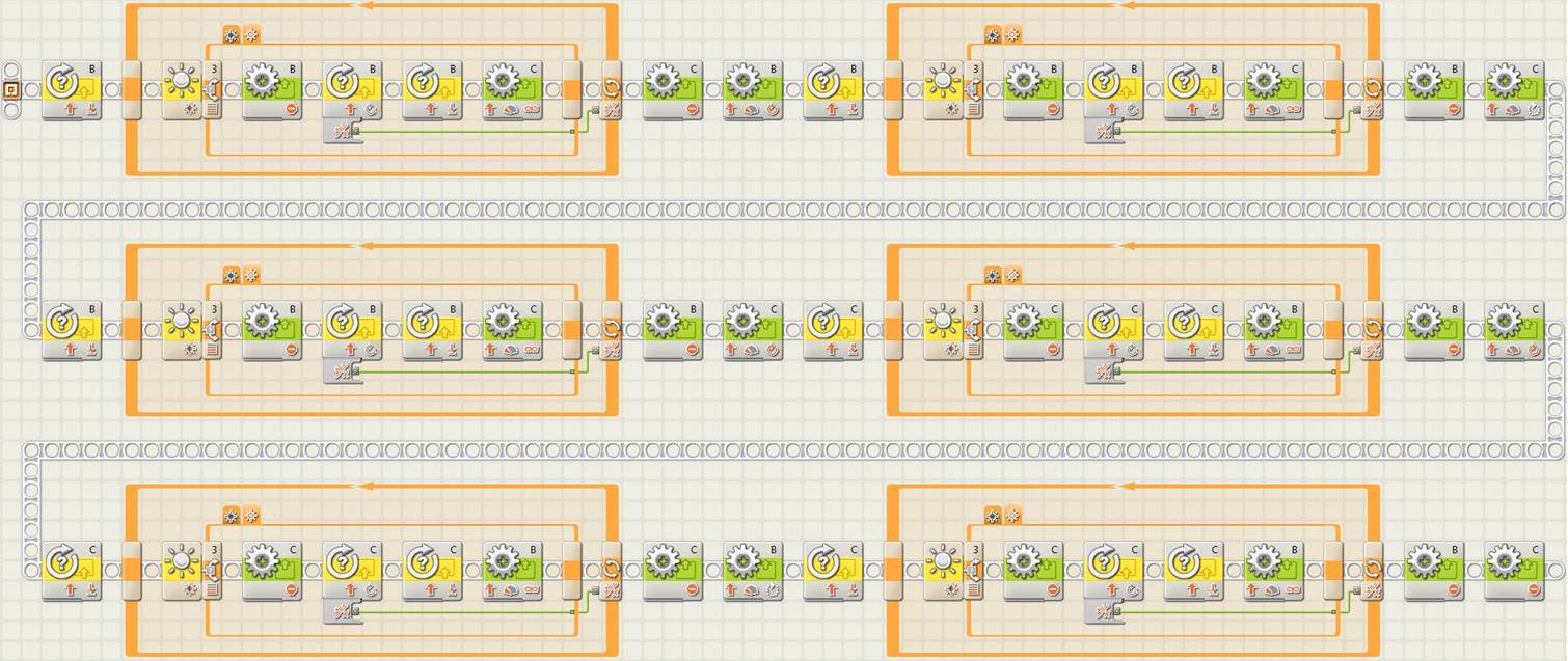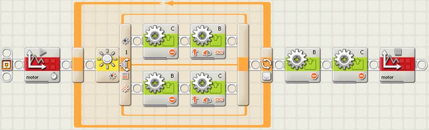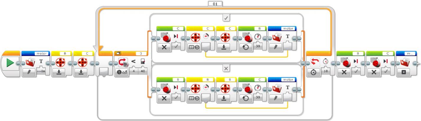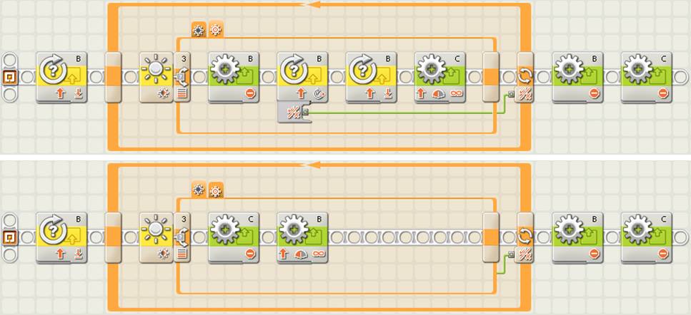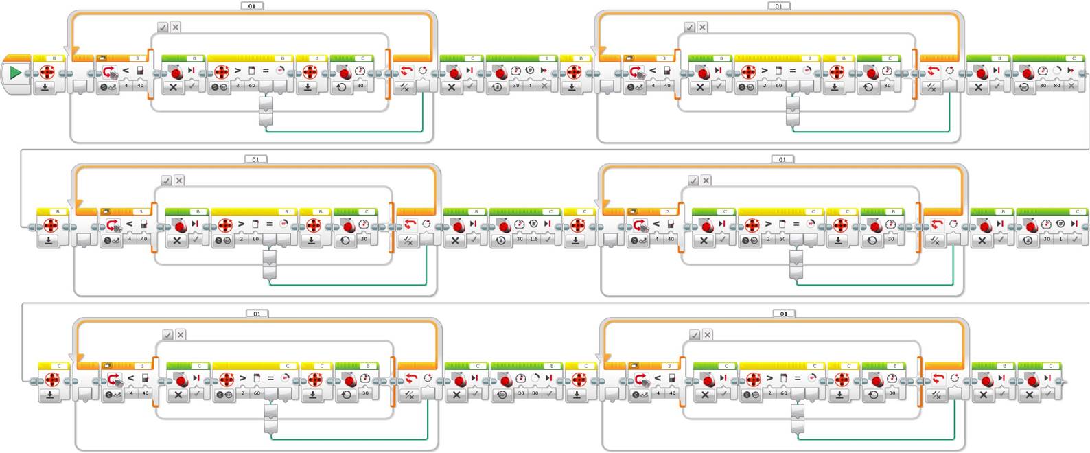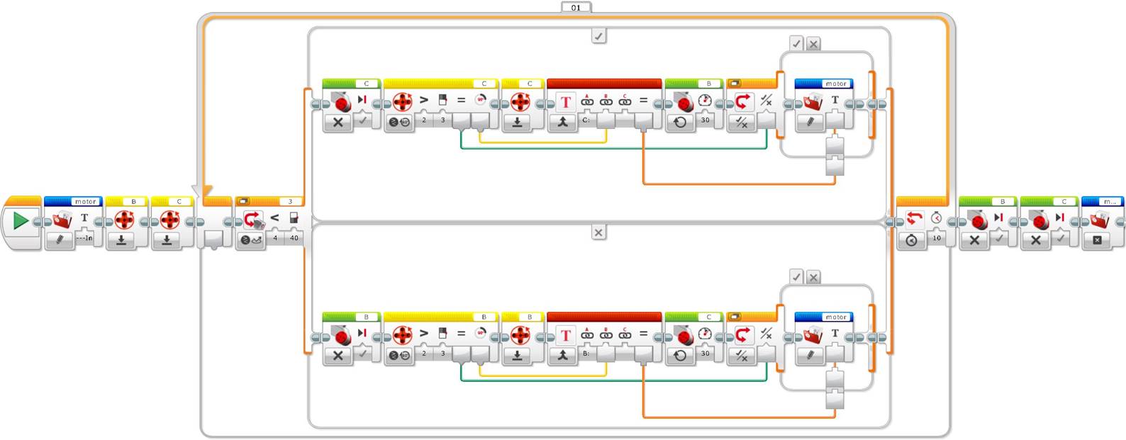 The simplest idea to demonstrate that the intelligent brick executes the program much faster than the robot’s apparent physical execution of the same program is to record the switch branch that is being executed in each iteration of the loop.