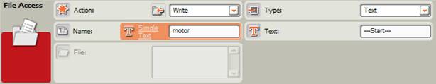 First we need to add an initial block configured with the “Write” action to write to a file, the name of the file we want to create, for example “motor”, the type of information we want to add, choose the option “Text” of the “Type” pulldown menu, to add an initial text “---Start---”, that will help us to know when the data logging starts in the text file.