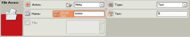 Next we will add two “File Access” blocks similar to the previous one at the end of both branches of the switch to write in the file the branch that the program just passed through. For example, when the program goes through the option where the motor B runs we will add “B” and when it goes through the other option we will add “C”, in the textbox “Text”.