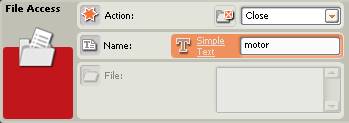 To finish the program, we need to close the file before stopping the program. For this we need to add a final block with the action “Close” to close the file. Be careful to always write in the appropriate filename, “motor” in our case. To avoid errors, a good option is to copy any previous block and modify the desired options.