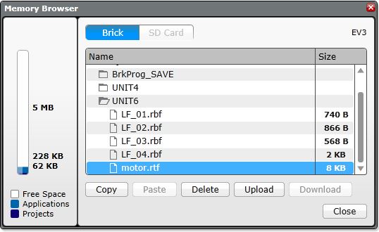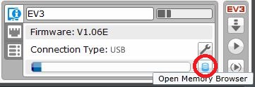 In EV3 click on the “Open Memory Browser” button in the program’s window lower right corner to open the EV3 memory management window where we will find the text file “motor.rtf”.