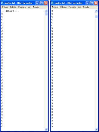 The final step is to open the “motor.txt” file (e.g. with “Notepad”), or “motor.rtf” (e.g. with “Word”) to view its contents. Observe that the generated text file has an extension “.txt” or “.rtf” that the program adds. Before opening it, it can be interesting to ask the students about what they think its contents will be and make them fill in the file manually on the black board. As we have mentioned before, the students who think that, meanwhile the robot goes from one color to the other, each switch’s branch will be executed only once will write in the file: “B, C, B, C, B, ...”, as shown in the following image.