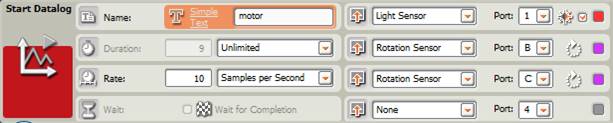 When configuring the start data logging block it is important to pay attention to different aspects. You need to give it a name that will be used later to stop the datalogging with the corresponding block that will generate the file with the experiment and with the “.log” extension in NXT and “.rdf” in EV3, in our example “motor.log” o “motor.rdf”. You need to define the duration to “Unlimited” or “On” to pass the time control to the loop that will repeat during 9 seconds –this allows starting the datalogging to start and immediately after start the robot line following–, and the rate with the number of samples per second to 10.