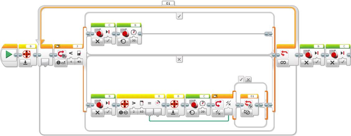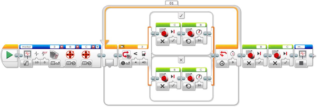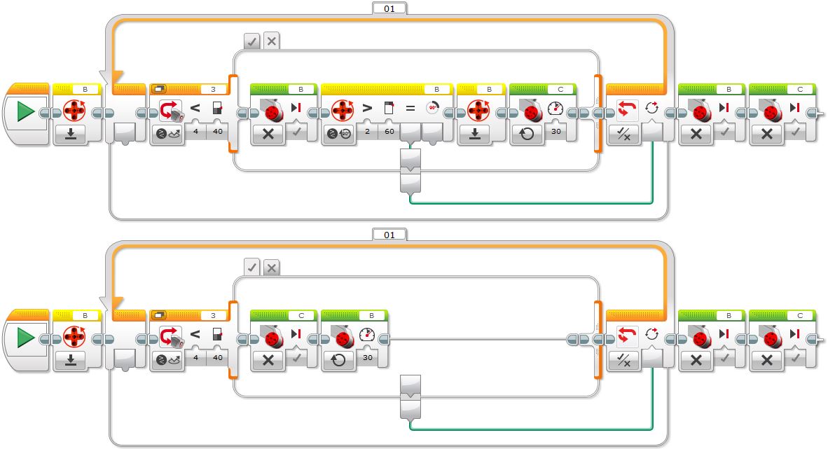The next challenge is to count how many degrees each motor turns before changing the branch of the switch inside the loop. Each motor turning degrees mainly depend on its power, as well as on the robot design, that in our case it is always the same for all the students. Initially we will suppose a power of 40% in NXT and 30% in EV3 to avoid the robot slipping. To accomplish this we will explicitly use the internal rotation sensor of each motor.