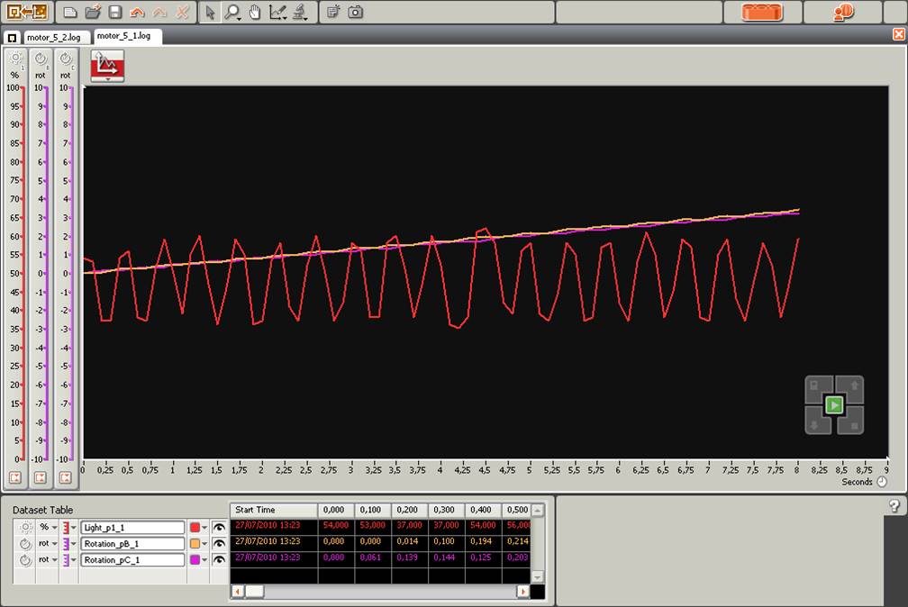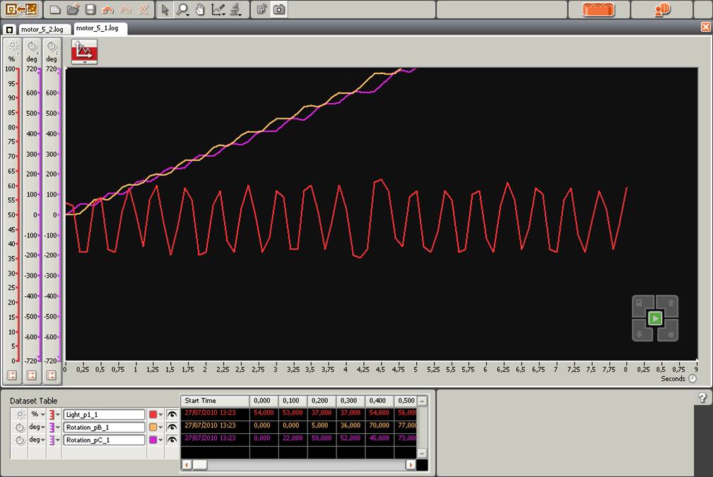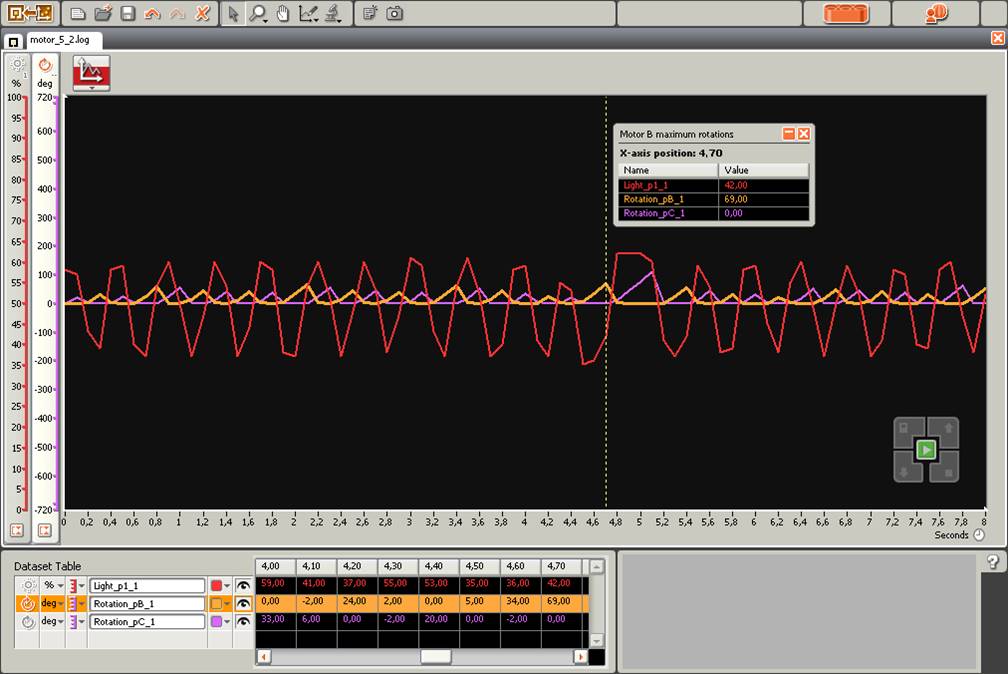 If we analyze the results, we will see that in NXT it is a little bit difficult to differentiate each motor’s rotations. It would be better to use degrees instead of rotations to express the motors movement and to obtain more relevant differences, but why? Because 1 rotation is equivalent to 360 degrees, that is 360 units, thus the differences are bigger. In EV3 the system chooses automatically this option. We can select the units, rotations or degrees, on the left side of each curve in NXT and on the “Dataset Table” tab in EV3. We can also choose the default desired units in the “Start Datalog” block attribute definition, as explained previously and as shown in the previous block attribute definition image.