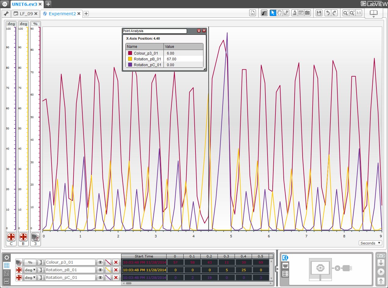 Finally, this graph image also shows a very interesting interface tool that allows querying the sensors values in a specific point, in our case the position around the 4.5 second where motor “B” rotations are the biggest and which corresponds to a line intersection on the line the robot follows. This tool can be accessed from the menu “Analysis Tools” in NXT or from the icon menu “Analysis” with the option “Point Analysis”. The line corresponding to the analyzed point in a specific time can be dragged to the desired point, in our case near the second 4.5. We can also name it, generate as many analysis points as we want, and save all these analysis points with the experiment for future use.