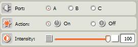In the Mindstorms NXT software we cab turn on or off the lamp using the Lamp block. The Lamp block has four parameters: Port, Action (On or Off) and Intensity, as shown below.