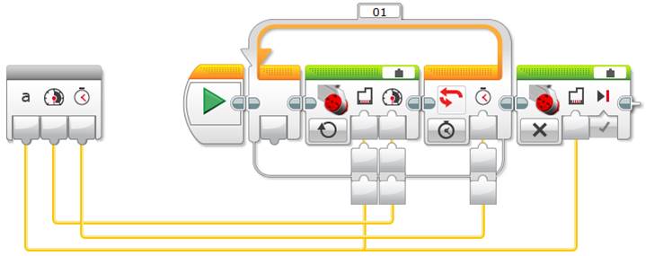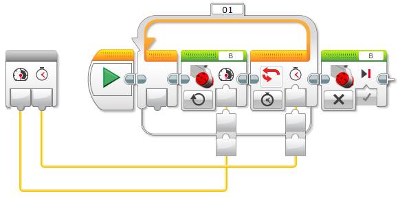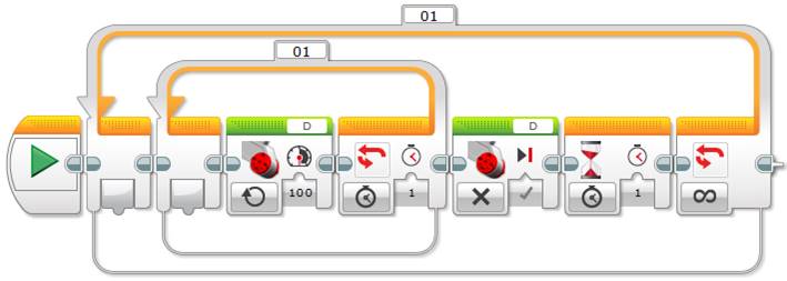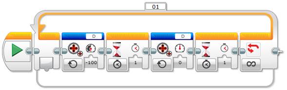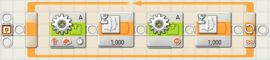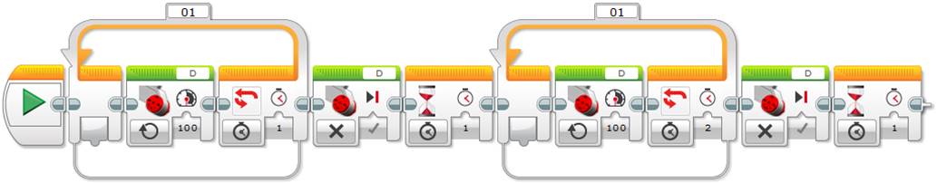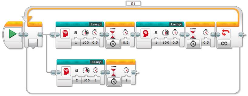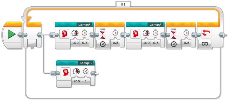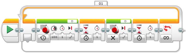 Now you can use the Unregulated Motor block to turn the lamp on and off repeatedly, just as the NXT’s Lamp block does, as shown below.