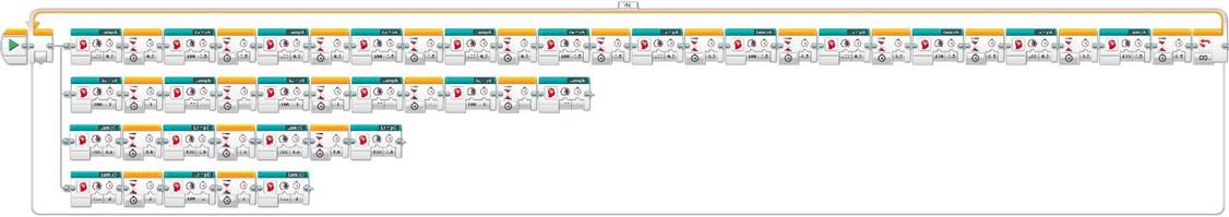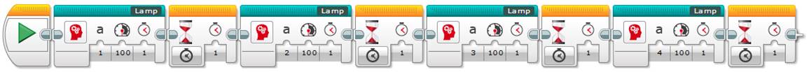 Another variation of the above program is to turn on all the lamps only for 0.5 seconds but using the same lighting sequence. The advantage of this last program pattern is that you only need to change the time each lamp block is on, you do not need to worry about the Wait blocks!