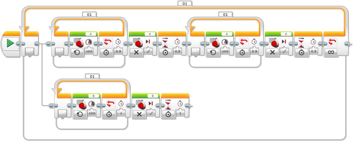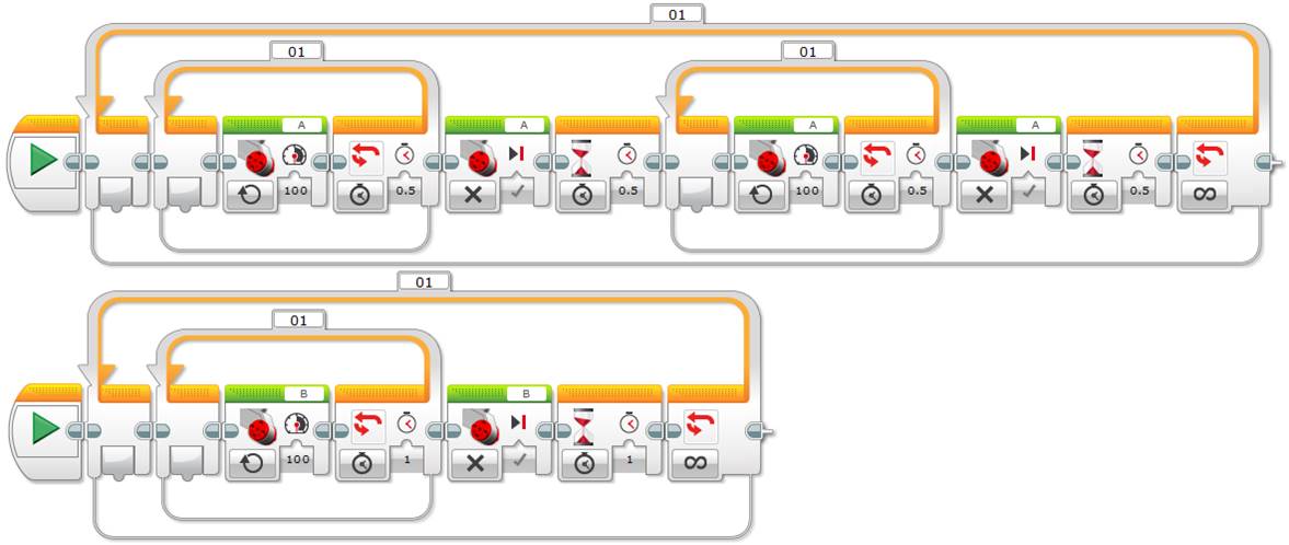 As before, note that we only need to add the last Wait block in the shortest time wait sequence, in our case the first one corresponding to 0.5 seconds, since the loop will start the next iteration only after finishing the longest sequence.
