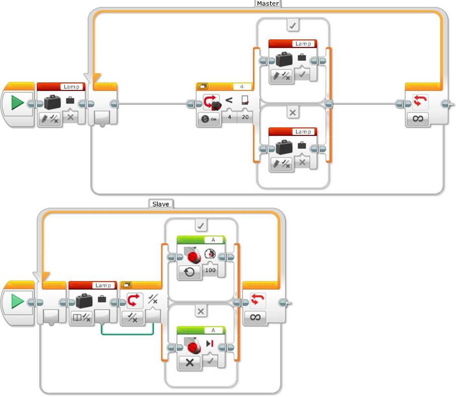 To implement a basic Master/Slave design pattern in EV3 we need at least two loops –the master or main program loop and the slave lamp loop– and a variable controlled by the main program in the master loop that tells the slave loop when to fire an action or a condition, in our case, when the lamp loop will turn the lamp on or off.
