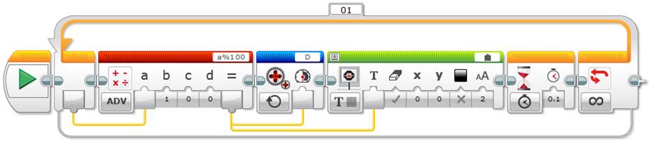 Tip: Note that the above program uses a Wait block to keep the lamp on for 0.1 seconds at each iteration of the loop, and a Display block to show, on the EV3 screen, the iteration remainder used as lamp power.