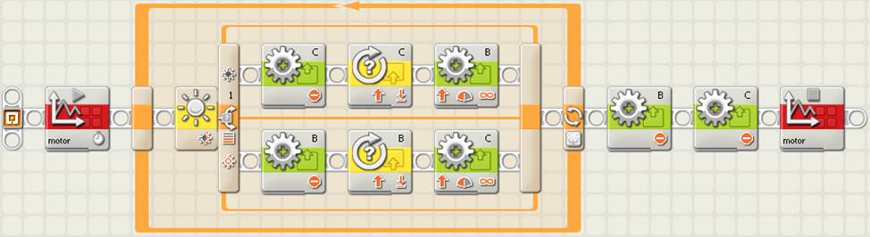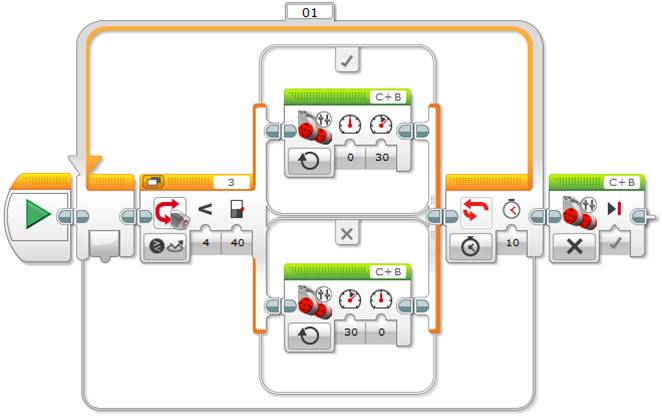 The simplest idea to demonstrate that the intelligent brick executes the program much faster than the robot’s apparent physical execution of the same program is to record the switch branch that is being executed in each iteration of the loop.