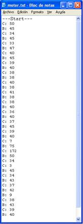 The final step is to open the “motor.txt” file (e.g. with “Notepad”), or “motor.rtf” (e.g. with “Word”) to view its contents. Observe that the generated text file has an extension “.txt” or “.rtf” that the program adds. Before opening it, it can be interesting to ask the students about what they think its contents will be and make them fill in the file manually on the black board. As we have mentioned before, the students who think that, meanwhile the robot goes from one color to the other, each switch’s branch will be executed only once will write in the file: “B, C, B, C, B, ...”, as shown in the following image.