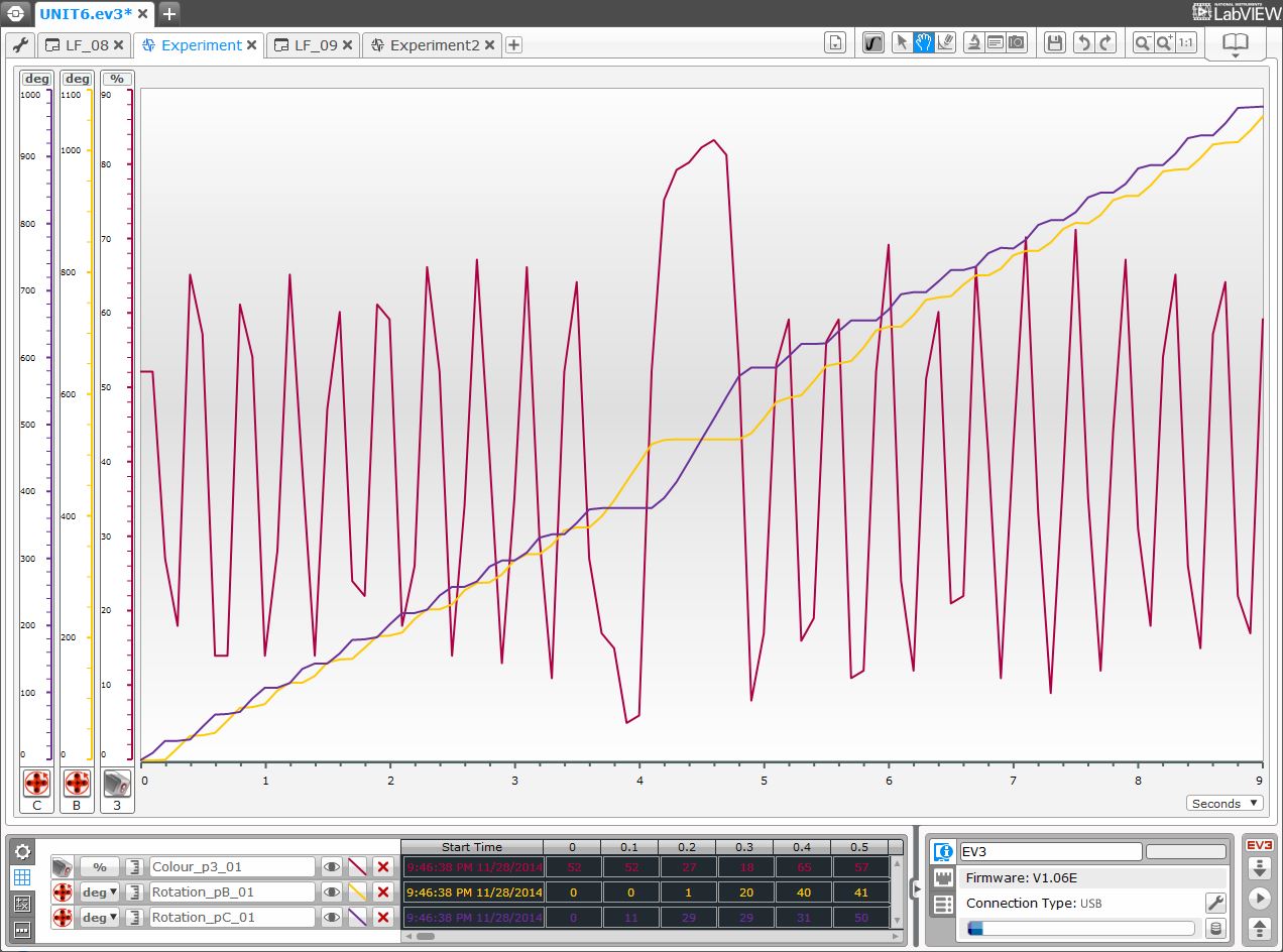 It also takes advantage of the datalogging feature within Mindstorms to automatically record data and visualize it graphically in the computer screen. This capacity to generate and relate the sensors’ readings different curves in function of time, called “experiment”, can be extremely useful in many and diverse situations. The LEGO Mindstorms NXT or EV3 software includes an interface devoted to data recording or data logging visualization that this unit explains in some detail, because it is very useful to deeply understand and better relate diverse concepts in a graphical manner.