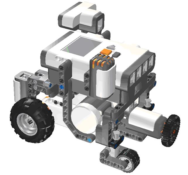 The following Mindstorms EV3 basic robot model, very similar to the NXT one, is a modification of the education model and can be built only with the pieces of the basic education set. The file “model basic EV3_0.lxf”, built with LEGO Digital Designer (LDD), corresponds to the model of the following images.