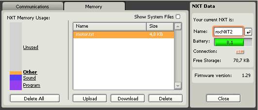 Once the program has been compiled and executed by the robot, connect the robot to the computer to find the generated file. For this click on the button that opens the NXT window and go to the “Memory” tab. Then choose the option “Other” memory to find the text file “motor.txt” in NXT.